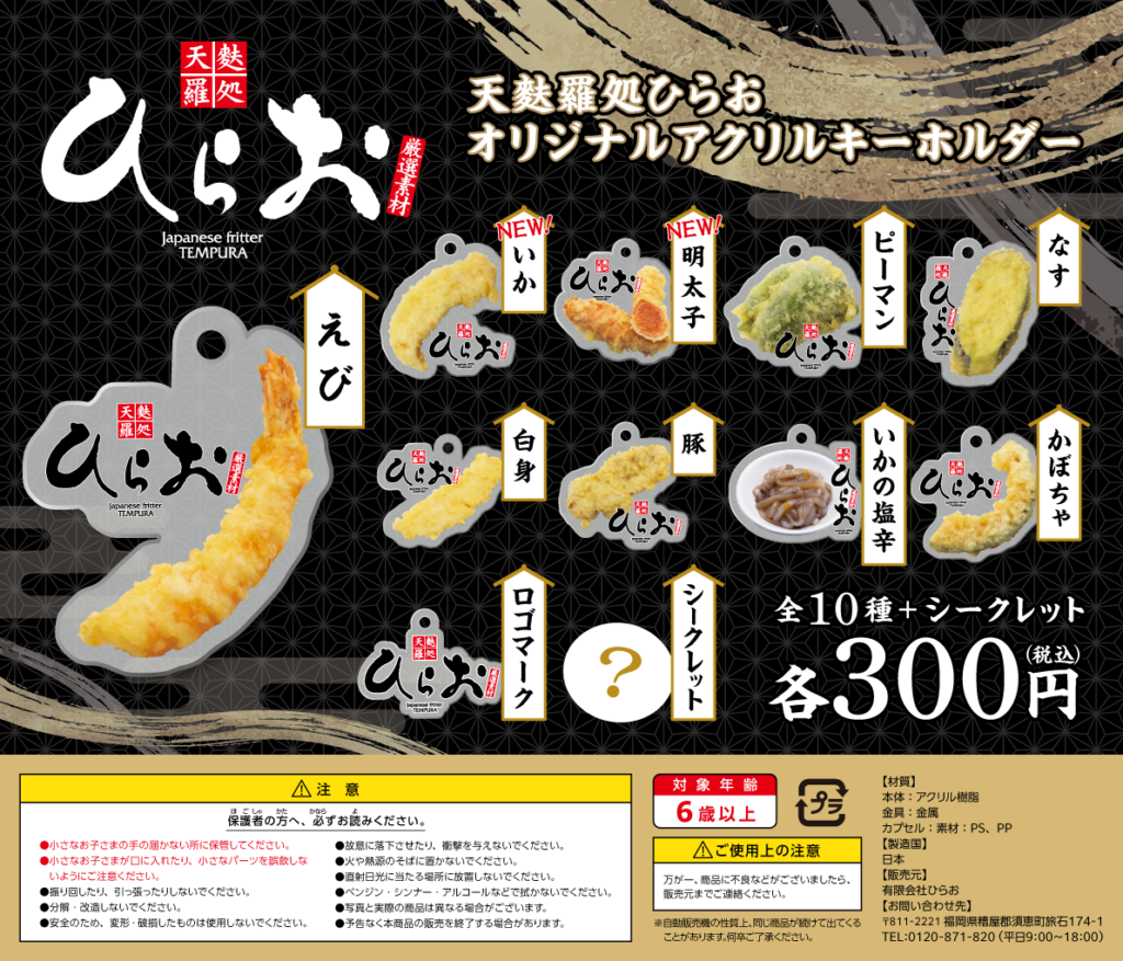 ただいま天麩羅処ひらお 本店・天神アクロス店・ 須恵店の3店舗にて、「天麩羅処ひらおオリジナルガチャガチャ」を設置しております。